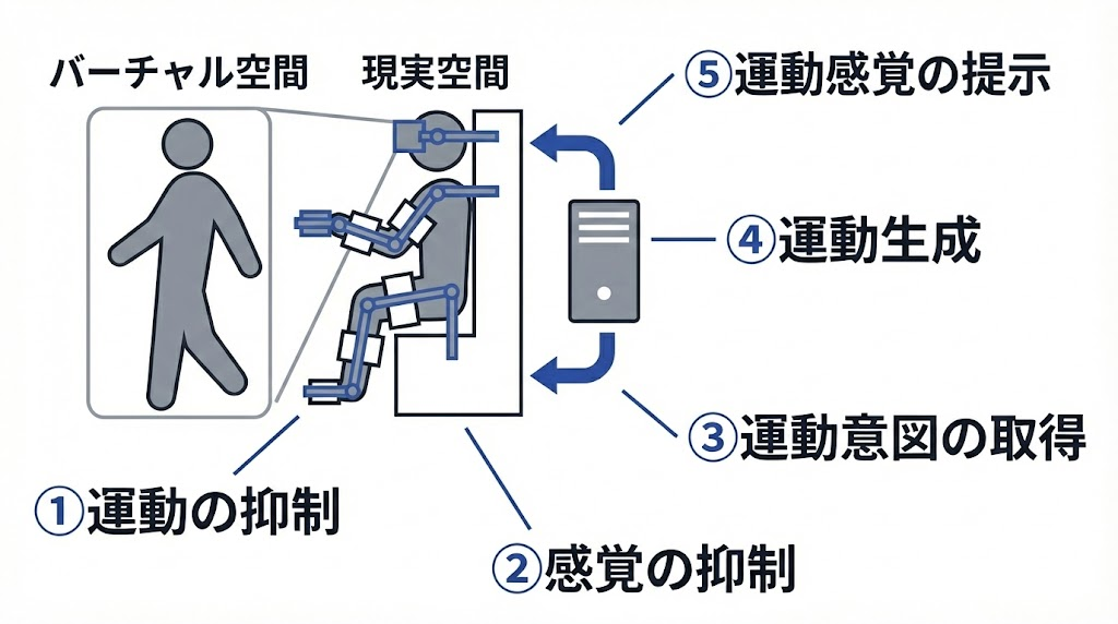 行為と感覚の成立が「現実世界」へ漏れてしまうからです。現実の身体運動が先に成立してしまうと、現実環境からの物理的な感覚入力(重力や床の感触など)が人工世界の設計と衝突し、体験の矛盾を防ぎにくくなります。