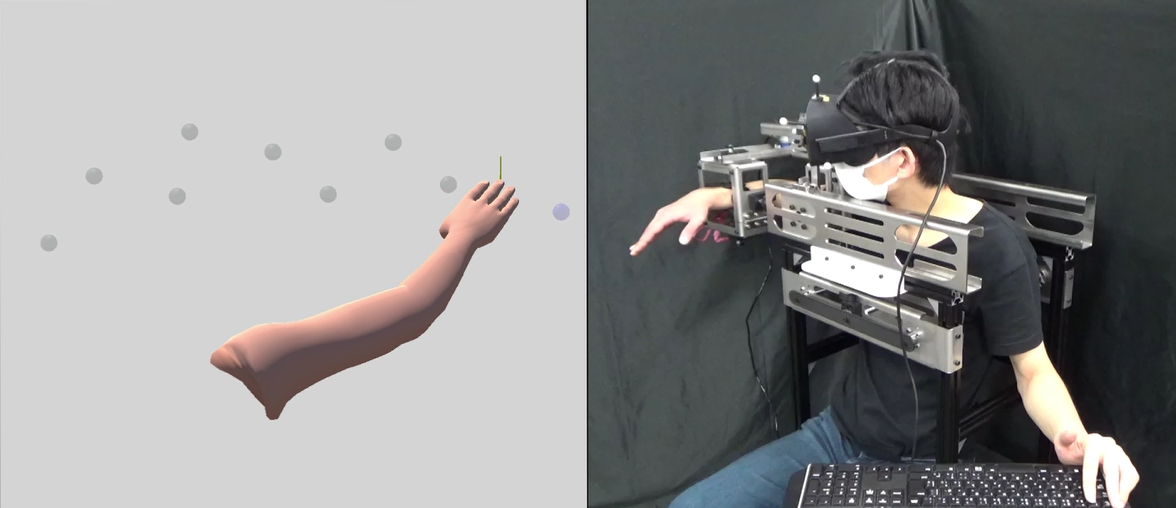 身体の認識をバーチャル環境のアバターに適合させる研究です。
